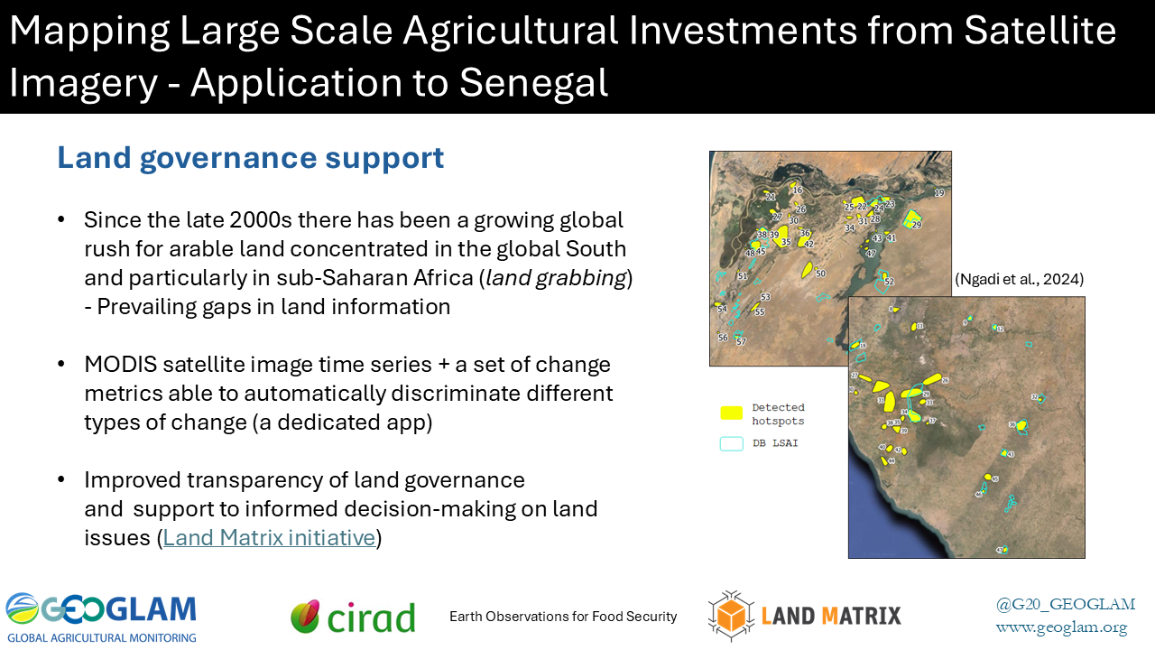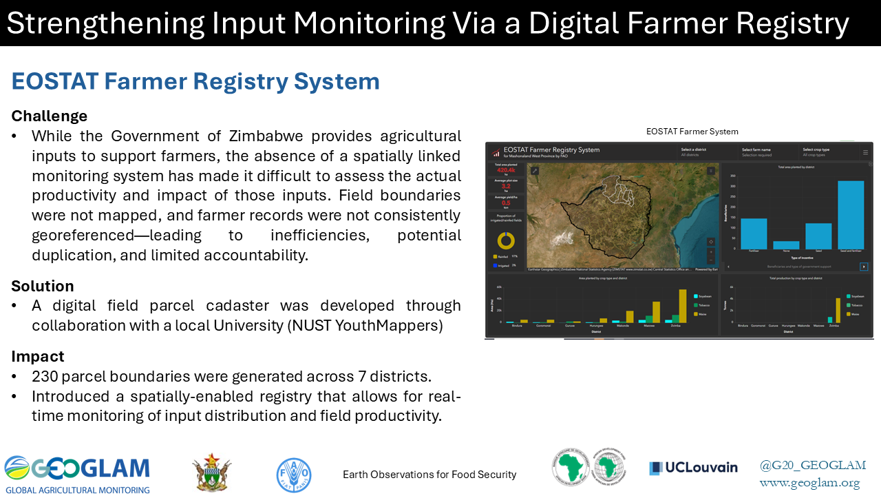 In 2011, at the request of the G20 Agriculture Deputies under the French Presidency, this community’s efforts came together in a proposal to coordinate global satellite-based crop monitoring. The proposal was endorsed by the G20 and launched as GEOGLAM at the Cannes Summit, alongside the Agricultural Market Information System (AMIS). Together, these initiatives aimed to reduce food price volatility and improve global food security through science-based, transparent data.